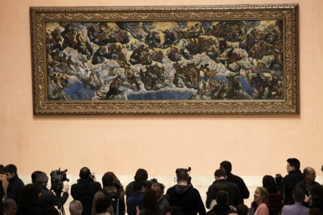 'El paraíso' de Tintoretto, una de las joyas de la colección del Museo Thyssen-Bornemisza, ha vuelto a su lugar habitual en el hall de la institución después de un proceso de restauración de ha durado casi dos años. El lienzo permanecía a tan solo unos metros de allí desde el pasado verano, detrás de una pantalla de cristal desde la que los visitantes han podido seguir 'en directo' el trabajo de los especialistas de la pinacoteca.